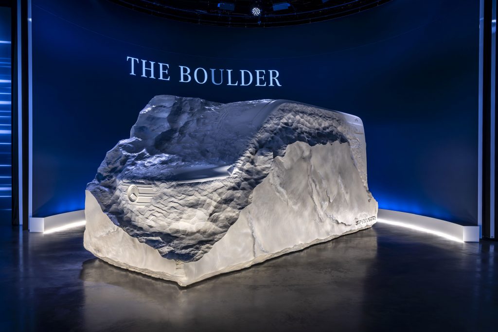 Οι επαγγελματικές εκδόσεις των Van αναπτύχθηκαν σε στενή συνεργασία με πελάτες από διαφορετικούς κλάδους και είναι απόλυτα προσαρμοσμένα στις ανάγκες τους. Αυτό αντικατοπτρίζεται και στη νέα σχεδίαση, την οποία υποδηλώνει ήδη το γλυπτό “THE BOuLDER”. Επιπλέον, το μελλοντικό Sprinter θα διατίθεται σε πολλές διαφορετικές εκδόσεις συστημάτων κίνησης, μήκους, μεταξονίου και μικτού βάρους οχήματος, ώστε να προσαρμόζεται σε ειδικές επαγγελματικές διαμορφώσεις και μετασκευές – από υπηρεσίες ταχυμεταφορών και ψυγεία, μέχρι κινητά συνεργεία, ασθενοφόρα, οχήματα διάσωσης, ανοικτές καρότσες για εργοτάξια, μεταφορά ατόμων με κινητικές δυσκολίες και οχήματα αναψυχής (Camper Vans).